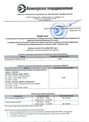 Прайс-лист на размещение агитационных материалов по выборам депутатов Государственной думы Федерального собрания Российской Федерации VII созыва и выборов депутатов Псковского областного Собрания депутатов в средстве массовой информации «Великолукская телерадиокомпания» телеканал «360», город Великие Луки.