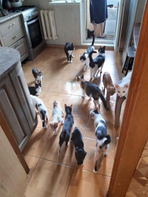 По словам автора в одной квартире живут 15 взрослых кошек (многие беременные), 15 кастрированных котов, 12 котят в возрасте около 1,5-3 месяцев, шесть подсосных, все остальные — подростки.