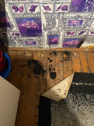 1В результате пожара повреждена отделка стены в районе раковины, обуглен деревянный пол, закопчена стена и оплавлена плитка.
