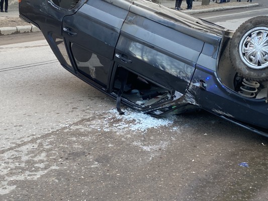 0В результате столкновения с автомобилем фонарный столб рухнул на проезжую часть, а автомобиль перевернулся на крышу.
