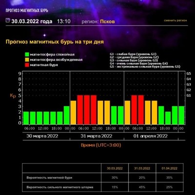 0Согласно графику, слабое возмущение магнитосферы начнётся утром 31 марта, но уже ближе к обеду интенсивность вспышки спадет, а к ночи магнитное поле успокоится. Повтор магнитной бури прогнозируется к утру 1 апреля.