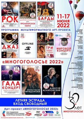 Мультиформатный арт – проект «Многоголосье» отмечает тридцатилетие со дня основания. Семь дней на летней эстраде будет звучать самая разнообразная музыка, которая представлена зрителям нашими талантливыми земляками. Собрать такой большой праздник смогла для вас команда арт-проекта под патронажем ДК ЛК. Бесплатно пригласить зрителей на эти великолепные концерты мы смогли благодаря гранту Президентского Фонда культурных инициатив и помощи администрации города. Ждём великолучан и гостей города на празднике музыки и хорошего настроения!