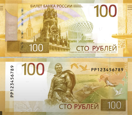 0Выпускаемая сторублевая банкнота посвящена Москве и Центральному федеральному округу. Основное изображение лицевой стороны — фрагмент Спасской башни Московского Кремля с курантами. На оборотной стороне — Ржевский мемориал Советскому Солдату.