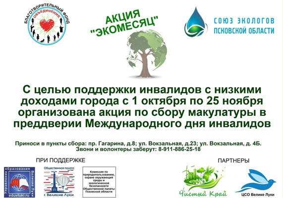 0Организаторами акции будут выступать Благотворительный фонд помощи детям-сиротам, инвалидам, ветеранам и малоимущим семьям «Объединение» и Союз охраны окружающей среды «Экологи Псковской области». А также поддержку окажет Общественная палата города Великие Луки, Управление образования города Великие Луки, Комиссия по природопользованию, охране окружающей среды и экологической безопасности Общественной палаты Псковской области.