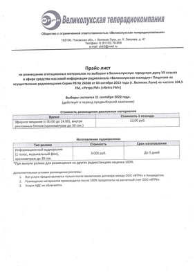 Прайс-лист на размещение агитационных материалов по выборам в Великолукскую городскую думу VII созыва в эфире средства массовой информации радиоканала «Великолукская мелодия». Лицензия на осуществление радиовещания Серия РВ №24366 от 04 октября 2013 года (г. Великие Луки) на частоте 104,5 FM, «Ретро FM» («Retro FM»).