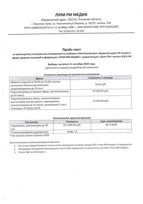 Прайс-лист на размещение агитационно-информационных материалов в эфире СМИ «ЛУКИ ФМ МЕДИА»