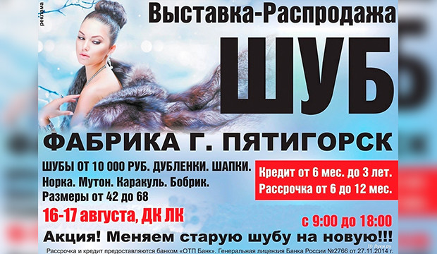 16 и 17 августа в ДК ЛК (ул. Зверева, 29) состоится выставка распродажа меховых изделий.