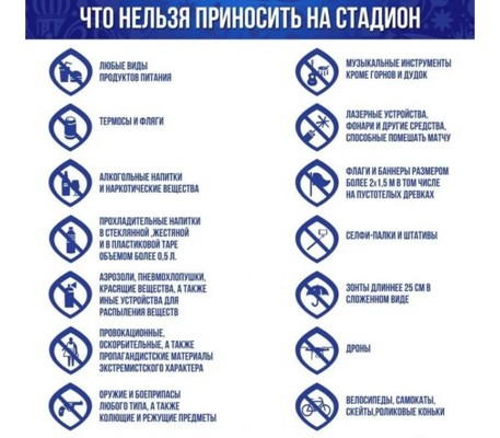 К запрещенным вещам относятся взрывчатые вещества, стеклянные бутылки, алкогольные напитки, химикаты, колющие и режущие предметы, бронежилеты, косметика, велосипеды, складные стулья и столы.