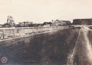 В годы Великой Отечественной войны Великие Луки подверглись мощнейшему разрушению. Одной из целей гитлеровцев всегда были мосты. Центральный мост через Ловать также не стал исключением. Часть моста была разрушена, что видно на снимке, который датируется 1946-1949 годами.