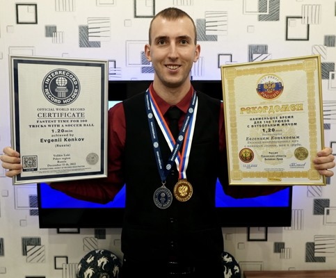 0За 1 минуту 20 секунд он выполнил 100 трюков. Евгений управлял футбольным мячом с помощью головы, шеи и груди.