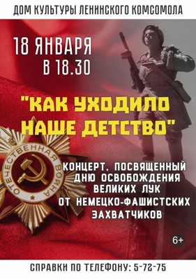 Великолучан приглашают на концерт «Как уходило наше детство» (6+) 17 января 2023 21:00 0 18 января в 18:30 в ДКЛК пройдет концерт «Как уходило наше детство», посвященный 80-летию освобождения Великих Лук от немецко-фашистских захватчиков. Вход — бесплатный. Поделиться: