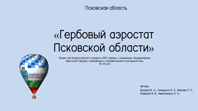 0Заочный этап конкурса проходил с 1 ноября 2022 по 11 февраля 2023 года. В номинации «Формирование туристского бренда, отражающего и продвигающего культурный код» великолучане представили проект «Гербовый аэростат Псковской области».
