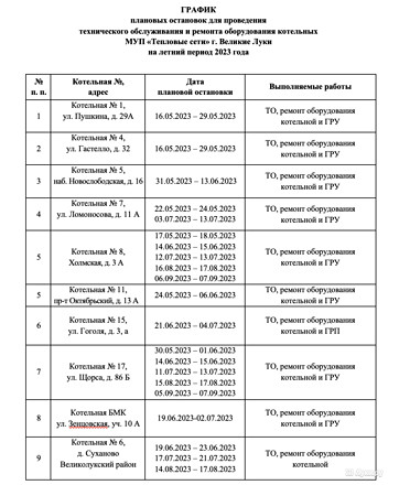 Редакции Луки.ру в руки попал график плановых остановок котельных и гидравлических испытания тепловых сетей.