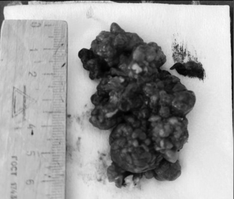 0Образование оказалось крупным: 60 на 40 миллиметров, длина ножки 15 миллиметров. Полип отправлен на дальнейшее гистологическое исследование.