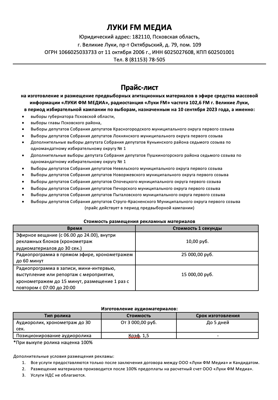 Прайс-лист на размещение агитационно-информационных материалов в эфире СМИ «ЛУКИ ФМ МЕДИА»
