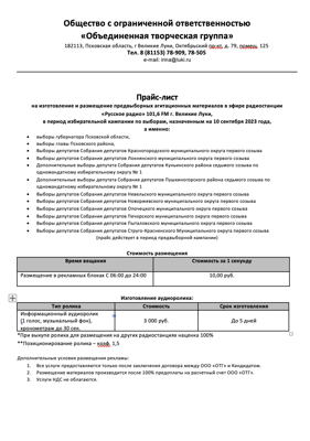 Прайс-лист на изготовление и размещение предвыборных агитационных материалов в эфире радиостанции «Русское радио» 101,6 FM г. Великие Луки, в период избирательной кампании по выборам, назначенным на 10 сентября 2023 года, а именно: