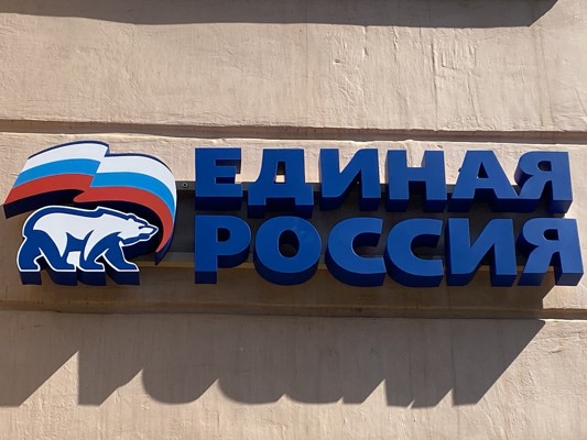 0Один из примеров — вывеска местного отделения партии «Единая Россия». Офис находится на центральном проспекте.