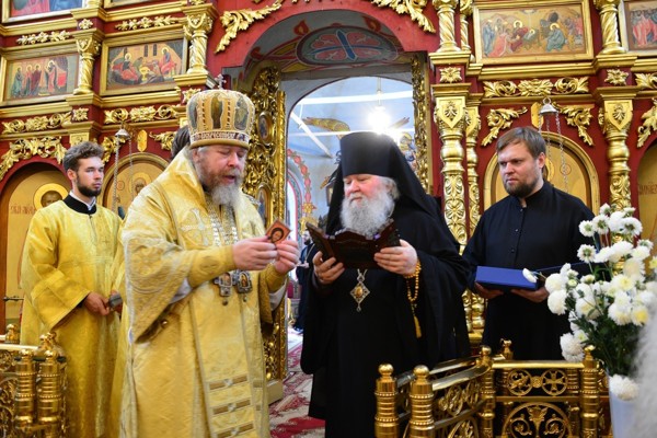 Далее, митрополит Тихон передал в дар Свято-Вознесенскому собору икону Спасителя и Псково-Печерских святых — преподобных Семеона и Корнилия. В свою очередь, Владыке Сергию митрополит подарил складень Успения Пресвятой Богородицы и преподобного Корнилия.