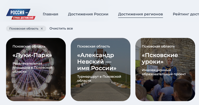 0На данный момент большинство голосов получил «Луки-Парк». Также в тройке лидеров — проект «Александр Невский — имя России». Это уникальный турмаршрут, посвящённый великому князю, который проходит по живописным историческим местам региона. На третьем месте — комплекс экскурсионно-познавательных туров «Псковские уроки».