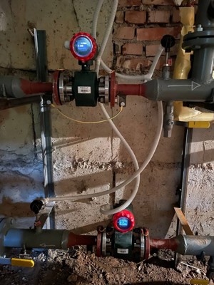 В подвале рабочие смонтировали узел подключения горячего водоснабжения, установили электромагнитный импульсатор — он управляет катушками, которые смягчают воду и предотвращают образование накипи в трубах. Также провели пусконаладочные работы, система введена в эксплуатацию.