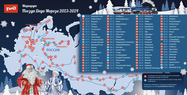 Стало известно, когда поезд Деда Мороза прибудет в Псковскую область 7 ноября 2023 19:00 0 Поезд Деда Мороза прибудет в Псковскую область 5 января 2024 года. В этом году поезд сделает остановку 5 января в Пскове и Дно. Великих Лук в расписании нет! Поделиться: