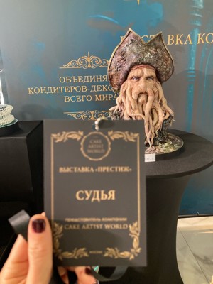 0Как сообщила Наталия Фадеева на личной странице ВКонтакте, она не только привезла свой торт в виде головы известного по фильмам «Пираты Карибского моря» пирата Дэйви Джонса, но и три дня собирала центральную композицию выставки в команде топ-мастеров «Cake artist world».
