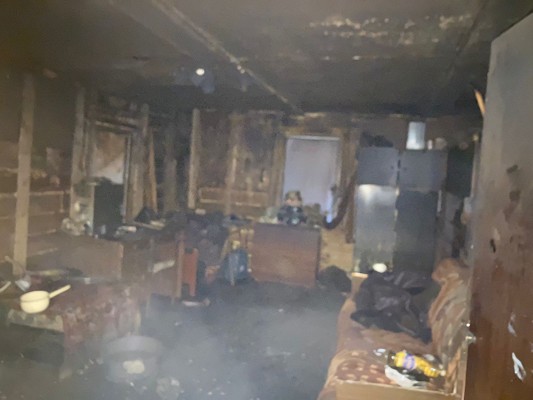 0В результате пожара полностью выгорела кухня. В комнате огнем повреждена стена. Сгорел диван, все закопчено.
