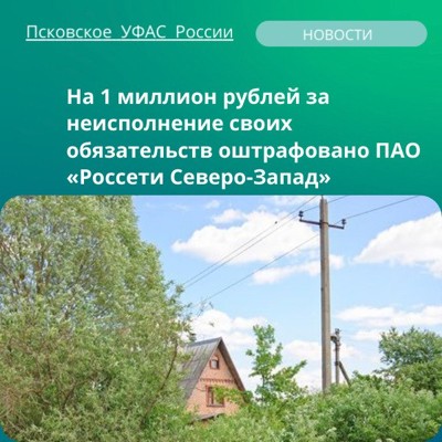 0В Псковское УФАС России поступили материалы из прокуратуры города Пскова в отношении ПАО о невыполнении требований законодательства с сфере электроэнергетики. ПАО «Россети Северо-Запад» должны были выполнить подключение объектов по четырем заключенным договорам, но не сделали этого в сроки.