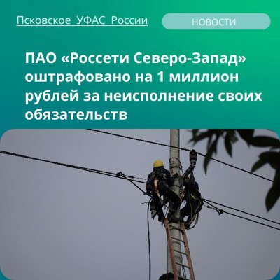 ПАО «Россети Северо-Запад» оштрафовано на 1 миллион рублей за неисполнение своих обязательств. Стоит отменить, что в процессе рассмотрения дела выполнено 5 техприсоединений домовладений к электросетям.