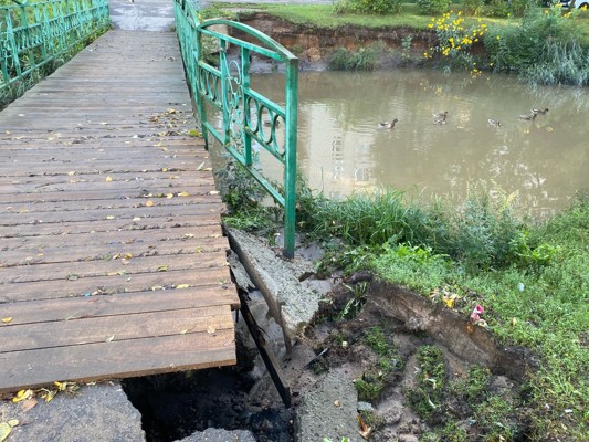 0Сегодня, 23 августа, мост выглядит совсем удручающе. Пройти по нему — настоящее приключение. Временное покрытие не справилось с размывом и край мостика разрушился еще сильнее. Кроме того, размыло и край берега с другой стороны, из-за этого урна рухнула вниз.
