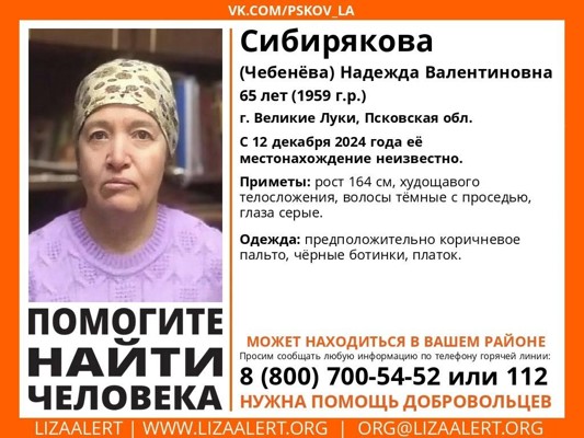 Всех, кто располагает информацией о местонахождении Надежды Сибиряковой, просят незамедлительно сообщить об этом в полицию: дежурная часть ОМВД России по г. Великие Луки 8(81153)5-27-94, или по телефонам 02, 112, либо поисковому отряду «След» +79113767676.