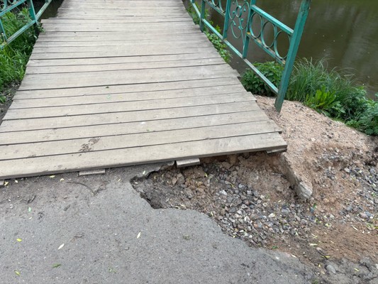 0Тем не менее, начался сезон ливней и первый же сильный дождь в мае еще больше размыл мост. К сожалению, место размыва не оградили и не обозначили: невнимательный пешеход, особенно ребенок, может пострадать при переходе через него.