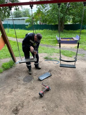 — заменены сломанные доски на лавочках, окрашены опоры качелей;
