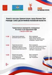 2 августа в Великих Луках отпразднуют 95 лет со дня образования ВДВ (0+) 31 июля 11:00 0 В субботу, 2 августа, в Великих Луках пройдут торжественные мероприятия, посвящённые 95-летию со дня образования Воздушно-десантных войск России. Афишей праздника поделились в городском Комитете культуры. Поделиться: