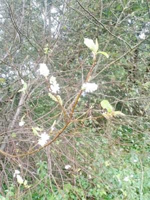 0Подписчица районной газеты «Заря» из деревни Покровское отмечает, что у черёмухи уже облетели листья, но на новых молодых ветвях распускаются зелёные листочки и, что самое интересное, белые кисти цветов.