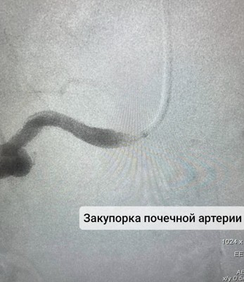 После проведения обследования возникли подозрения на сосудистые проблемы в области почек. В ходе ангиографии было подтверждено наличие значительной закупорки правой почечной артерии — до 95%. В место поражения сосуда был установлен стент.