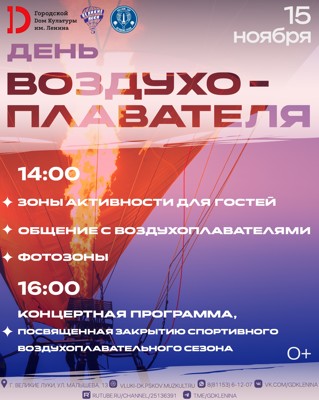 0В этот день с 14:00 великолучан будут ждать воздухоплавательные экспозиции и выставки, фотозоны, общение с воздухоплавателями Великих Лук всех поколений, творческие и воздушные мастер-классы, а также знакомство с воздухоплавательным спортом и даже соревнования для всех желающих.