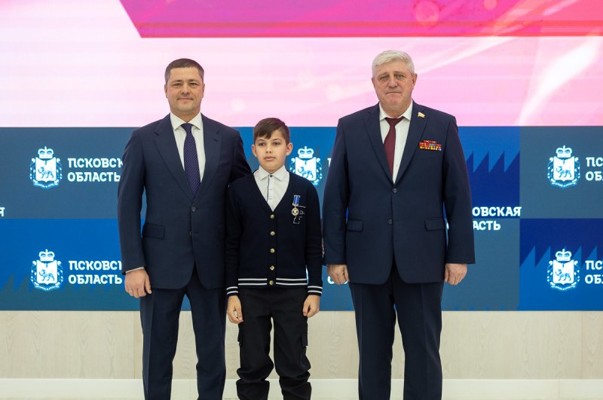 Губернатор Михаил Ведерников вместе с сенатором Совета Федерации Федерального Собрания Российской Федерации от Псковской области Алексеем Наумцом вручил ребятам памятные медали Совета Федерации «За проявленное мужество».