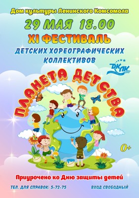 29 мая в 18:00 в Доме культуры Ленинского Комсомола состоится XI фестиваль детских хореографических коллективов «Планета Детства» (0+), приуроченный к Дню защиты детей.