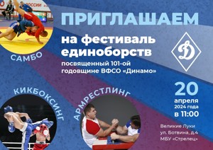 20 апреля в Великих Луках пройдет фестиваль единоборств, посвященный 101-й годовщине ВФСО «Динамо». (6+) Об этом сообщают в группе клуба единоборств «Отечество — Псковская область» ВКонтакте.