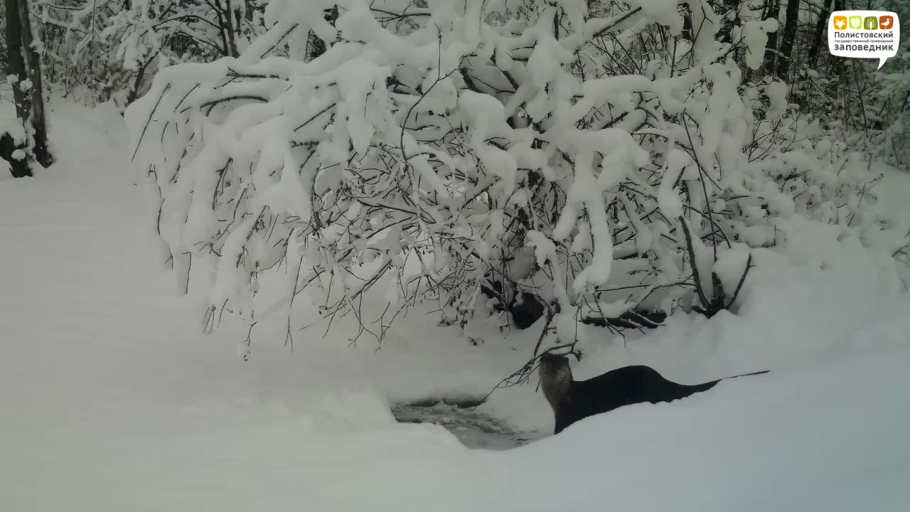 Фотоловушка Полистовского заповедника сняла выдру, обследующую лунку вблизи жилища бобров.