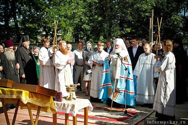 Перед тем, как купол был поднят на храм, к собравшимся обратился митрополит Псковский и Великолукский Евсевий. Он назвал сегодняшнее событие историческим и заметил, что возведение храма в честь святых мучениц — это общее доброе дело: он строится всем миром и в будущем непременно станет украшением Пскова. "Русский народ всегда любил храмы божие и колокольный звон. Храм — это училище благочестия, лечебница души и тела, символ жизни народа", - сказал владыка Евсевий. По его словам, Псковщину отличает обилие церквей, паломники называют её второй Палестиной, которая имеет множество святых мест.