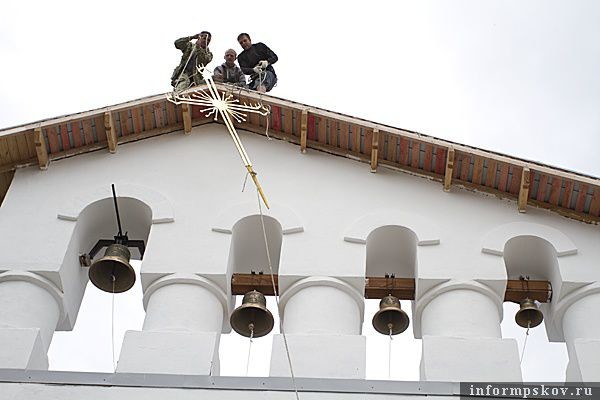 Старинный крест XVIII века установлен на звоннице строящегося в Пскове храма