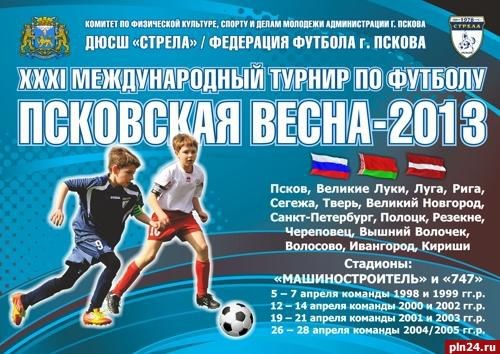 Сегодня в Пскове стартовал XXXI международный юношеский турнир по футболу «Псковская весна-2013». В этом традиционном соревнование вместе с псковичами и великолучанами сыграют команды из Санкт-Петербурга, Киришей, Луги, Твери, Великого Новгорода, Череповца, Вышнего Волочка, Сегежи, а также Резекне и Риги из Латвии, сообщает корреспондент Псковской Ленты Новостей. Как и в прошлом году «Псковская весна-2013» охватит 7 возрастных категорий: U15 (5–7 апреля) – юноши дата рождения после 1.1.1998 U14 (5–7 апреля) – рожд. после 1.1.1999 U13 (12–14 апреля) – рожд. после 1.1.2000 U12 (19–21 апреля) – рожд. после 1.1.2001 U11 (12–14 апреля) – рожд. после 1.1.2002 U10 (19–21 апреля) – рожд. после 1.1.2003 U9 (26–28 апреля) – рожд. после 1.1.2004 В первом заезде, с 5 по 7 апреля играют команды 1998 и 1999 гг.р., всего 8 команд. За призы «Псковской весны – 2013» в возрастной группе U15 поборются: «Стрела» (тренер Коркунов С.В.), «Псков-747» (тренер Дмитриев А.А.), «Экспресс» Великие Луки (Миронов А.В.) и «Факел» (Кириши). В возрастной группе U14 соперничать будут: «Стрела» (Барканов А.П. и Гультяев А.Н.), «Экспресс» Великие Луки (Штылин И.В.), СДЮСШОР Тверь (Тверь) и «Мостоотряд-6» (Великий Новгород).