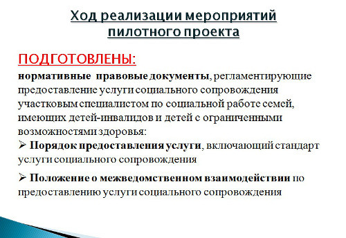 Как уже сообщалось ранее, в апреле 2013 года Псковская область выиграла конкурс Всероссийского Фонда поддержки детей, находящихся в сложной жизненной ситуации, и стала одним из пяти пилотных регионов, который начал прорабатывать модель сопровождения семей с детьми-инвалидами и детьми с ограниченными возможностями здоровья. Первый пошёл По условиям конкурса, уже к декабрю у псковичей должен быть готов отлаженный механизм такой работы. Несмотря на предельно сжатые сроки, Псковская область справилась с этой задачей раньше намеченного, и уже представила действующую региональную модель сопровождения семей с детьми-инвалидами и детьми с ограниченными возможностями здоровья на экспертизу в Москву. Подтверждением чему стало изданное 23 октября постановление региональной администрации под номером 481 "Об организации работы по сопровождению семей с детьми-инвалидами и (или) детьми с ограниченными возможностями здоровья на территории Псковской области", которое утверждает порядок предоставления этой услуги, включая её стандарт, а также положение о межведомственном взаимодействии по её предоставлению. Это стало возможным потому, что одним из главных условий участия в конкурсе было наличие в регионах не только опыта подобной работы, но и стараний создать механизм сопровождения семей с детьми-инвалидами собственными силами, не дожидаясь необходимых для этого изменений в российском законодательстве. В новом законе о социальном обслуживании населения, который уже прошёл первое чтение в Государственной Думе, сопровождение семей с детьми-инвалидами будет прописано отдельной строкой. А механизм такого сопровождения каждому региону придётся вырабатывать самостоятельно. Вот для того-то Москве и понадобился опыт передовых в этом отношении регионов, чтобы они проторили дорожку всем остальным и показали, как эту работу лучше делать. Пилотными регионами в этом проекте наряду с Псковщиной были выбраны Новосибирская, Вологодская, Владимирская области, а также Забайкальский край. Все они принялись разрабатывать административный регламент и стандарт предоставления новой услуги, а также модель оказания семьям с детьми-инвалидами и детьми с ограниченными возможностями здоровья такого рода помощи, включая порядок межведомственного взаимодействия для её осуществления. Итоги этой работы изучит прикреплённый к Фонду научно-исследовательский институт, которому поручено подготовить модельный проект документов по сопровождению семей с детьми-инвалидами, годящийся для использования в любом российском регионе. Итак, псковская модель уже готова. Причём на суд московских специалистов сначала был представлен черновой проект, они досконально его изучили, выехали в районы Псковской области, проверили, как это осуществляется на практике, провели с местными социальными работниками несколько совещаний и только после этого приняли к рассмотрению проект, сделанный уже, что называется, "под ключ". Стандарт услуги Что же это за новая услуга такая – "сопровождение семей с детьми-инвалидами и (или) детьми с ограниченными возможностями здоровья"? Она заключается в том, что специально обученный человек – участковый социальный работник на территории отведённого ему участка изучает условия, в которых проживают такого рода семьи, выясняет, какая 