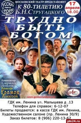 17 апреля к дню рождения Бориса Стругацкого и к Дню Космонавтики в ГДК имени Ленина в Великих Луках состоится уникальный спектакль «Трудно быть Богом». Как сообщили Псковской Ленте Новостей в городском комитете культуры, спектакль пройдет в рамках гастрольного тура по Северо-Западу России московского театра «Русский Терем». Постановка создана на основе романа Аркадия и Бориса Стругацких «Трудно быть Богом» и их же пьесы «Без оружия». «Сценическая редакция естественно отличается от романа, так как у театрального действа свои законы. Это самый романтичный, мушкетёрский и одновременно философский роман Стругацких. И постановка театра признана профессионалами лучшей сценической версией романа!» - отметили в городском комитете культуры. Коллектив театра побывал в разных городах - Ржеве, Муроме, Кинешме, Коврове, Петербурге, Великом Новгороде Билеты продаются в кассе ГДК им. Ленина и Художественном салоне (пр. Ленина, 30/9).