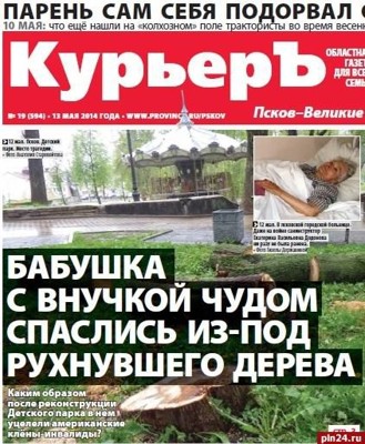 Обзор газеты «КурьерЪ. Псков-Великие Луки», № 19 (595), 13.04.2014 года. Читайте и передавайте своим соседям: «Смыло мост через Шелонь». В воскресенье, 11 мая, жители улицы Победы в Порхове лишились пешеходного моста, соединяющего центр города и правый берег. «За считанные минуты потоком воды снесло настилы, - жалуется 12 мая Татьяна Иванова, жительница Порхова, позвонившая в редакцию. - Год назад хороший подвесной мост у нас уже смыло паводком, взамен построили этот, но результат на лицо. Теперь жители улиц Победы, Железнодорожной и Порховской снова отрезаны от мира». «В парке на ветерана войны упал американский клен». В воскресенье, 10 мая, перед грозой от порыва ветра рухнуло дерево на 93-летнюю псковичку и её 29-летнюю внучку. Обеих женщин срочно увезли на скорой. На следующий день, утром 12 мая, в первой палате травматологического отделения Псковской городской больницы журналист разыскал Екатерину Додонову. «Представляете, первый раз в жизни на больничной койке, да я и не болела серьезно ничем, - отзывается пострадавшая. – Всю войну прошла санинструктором, под Москвой была, в Польше, сколько бомбежек пережила, сколько раненых вынесла, а тут дома на войну попала…» «Чудесное спасение на воде». В Пскове наградили двоих мужчин, которые вытащили с того света 10-летнего Артёма в Новоржевском районе. Александр Михеенко и Дмитрий Тимофеев не просто оказались в нужное время в нужном месте, а совершили подвиг. «Мужчины проезжали мимо озера Росцо и заметили пустую лодку, - рассказала журналисту «Курьера» 12 мая Татьяна Козина, сотрудник пресс-службы ГУ МЧС России по Псковской области. - На берегу стоял ребёнок, мужчины остановились и узнали, что возле лодки тонет его друг Артем. Мужчины не растерялись, тут же нашли другую лодку и поплыли спасать ребёнка, - продолжает Татьяна Козина. - К тому моменту он уже не двигался и посинел. Александр Михеенко и Дмитрий Тимофеев подняли мальчика на лодку, умело провели необходимые реанимационные действия…» «Тракторист скончался от взрыва». Житель деревни Бутыньки Себежского района 10 мая скончался от непроизвольного взрыва снаряда у себя дома. «Гуляют разные слухи: что парень чуть ли не вместе с трактором подорвался, когда пахал, – поделился 12 мая своими соображениями с журналистом газеты Алексей, житель Себежского района. – Но сейчас будут говорить все, что угодно. Сказали, что снаряд он вырыл за деревней Клин, когда пахал в поле». Что же произошло в деревне на самом деле? Об этом журналисты газеты узнали по горячим следам... В 20-х числах апреля тракторист вместе с коллегой обрабатывал поля в районе Томсино. Там они и обнаружили металлическую коробку со снарядами от авиационной пушки (калибра 20 мм) времен Великой Отечественной войны. Добычу якобы поделили и отнесли по домам... ПО версии следствия, 28-летний парень решил распилить находку, которая взорвалась у него в руках. Пострадавший скончался от полученных травм. Изнутри дома повреждены два окна. Со слов тех очевидцев, кто ездил на опознание, вокруг море крови и куски мяса, оторванные пальцы. Сам тракторист лежал на животе… «Жить с Пересадой – не поле перейти». Очерк. В Печорах есть удивительная семья, любовь которой держится на творчестве мужа и стойкости жены. От автора: увидев в одном из городских кафе «каменный цветок» из сказочных изразцов, захотелось встретитьс