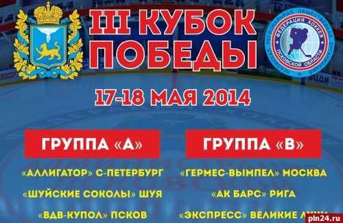 В предстоящие выходные в Пскове состоится международный турнир по хоккею «Кубок Победы». За главный приз будут вести борьбу шесть команд из Риги, Санкт-Петербурга, Москвы, Шуи, Пскова и Великих Лук, сообщает корреспондент Псковской Ленты Новостей. Откроется турнир матчем псковских армейцев и «Шуйских Соколов». Расписание матчей: 17 мая 09:30 «ВДВ-Купол» - «Шуйские Соколы» 11:00 «Гермес-Вымпел» - «Экспресс» 16:15 «Шуйские Соколы» - «Аллигатор» 17:30 «Ак Барс» - «Гермес-Вымпел» 18:45 «Аллигатор» - «ВДВ-Купол» 20:00 «Экспресс» - «Ак Барс» 18 мая 09:00 игра за 5-е место 10:15 1-й полуфинал 11:30 2-й полуфинал 14:15 игра за 3-е место 15:30 Финал