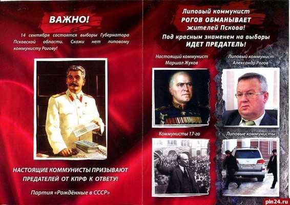 В Псковской области от имени партии «Рожденные в СССР» выпущена листовка, где кандидат на должность губернатора Псковской области от КПРФ Александр Рогов назван «липовым коммунистам». Авторы агитки сравнивают нынешних членов КПРФ с коммунистами прошлых лет: «настоящим коммунистом Маршалом Жуковым», «настоящими коммунистами 17-го года, 20-х, 30-х, 40-х, 50-х годов». По мнению авторов листовки, нынешние коммунисты «прихватизировали память о великой стране». Как сообщили Псковской Ленте Новостей в пресс-службе Псковского обкома КПРФ, Александр Рогов направил в Центральную избирательную комиссию РФ жалобу на распространяемые на территории Псковской области, в частности, в г. Великие Луки, листовки, имеющие все признаки «черных PR-технологий». Коммунист требует выявить изготовителей данной незаконной продукции и принять меры по пресечению их распространения на территории г. Великие Луки, а также на территориях других населенных пунктов Псковской области.