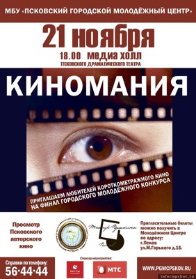 Как я не раз уже писал, если что и наполняет мою душу священным трепетом (помимо звёздного неба и нравственного закона), так это неиссякаемый запас неожиданных открытий, которые можно совершить у нас во Пскове. Вот давеча обнаружился настоящий кинофестиваль – городской фестиваль короткометражного кино «Киномания» – причём уже пятый по счёту, а я в первый раз о нём слышу (впрочем, далеко не я один, как удалось выяснить при помощи экспресс-опроса по знакомым). Несмотря на формальную провинциальность и короткий метр, фестиваль этот обладает всеми внешними признаками модного мероприятия – судите сами: в жюри присутствует известный артист, имеется ряд вполне «оскаровских» номинаций, финал проходит в медиа-холле Пушкинского театра – ну как такое можно пропустить, особенно если изо всех сил стараешься быть культурным человеком.
